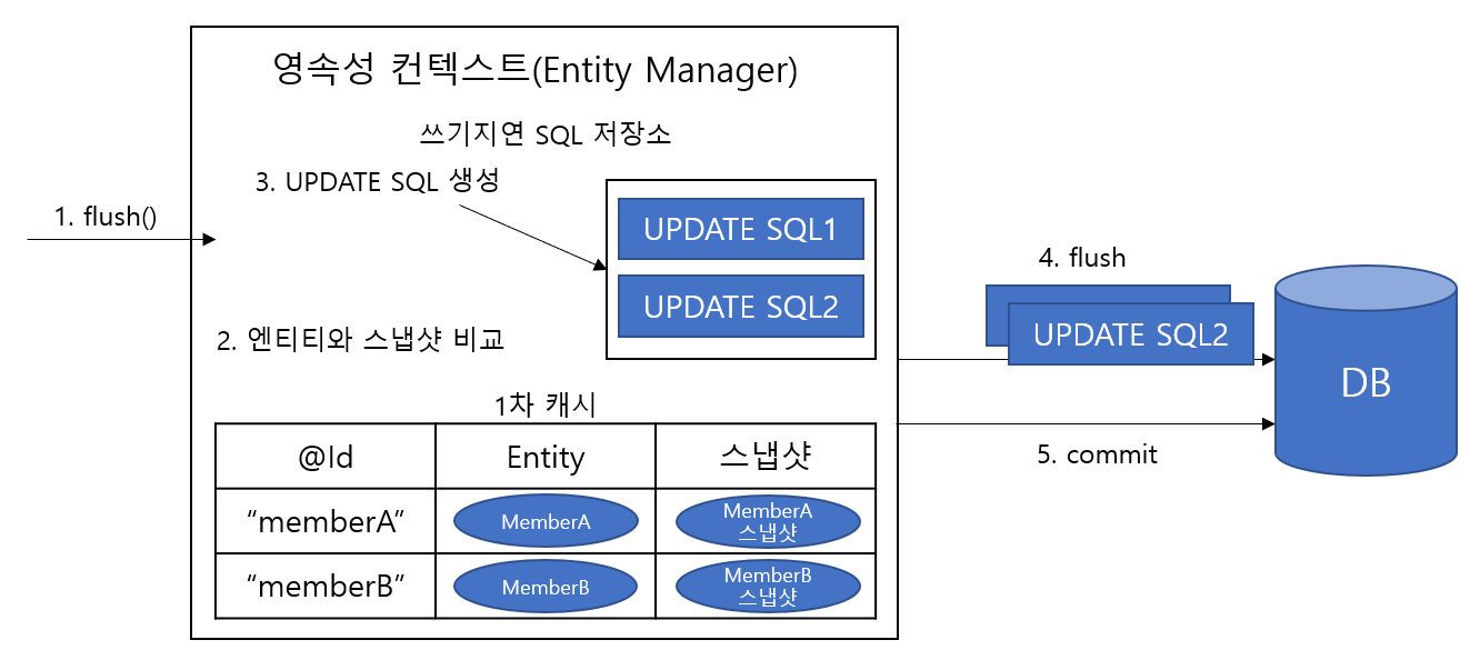 JPA 영속성 컨텍스트 내부에 엔티티의 최초 상태를 복사하여 저장해두는데 이를 스냅샷이라 한다. 트랜잭션이 커밋되면 스냅샷과 엔티티의 값을 비교하여 데이터 베이스에 변경사항을 반영한다.