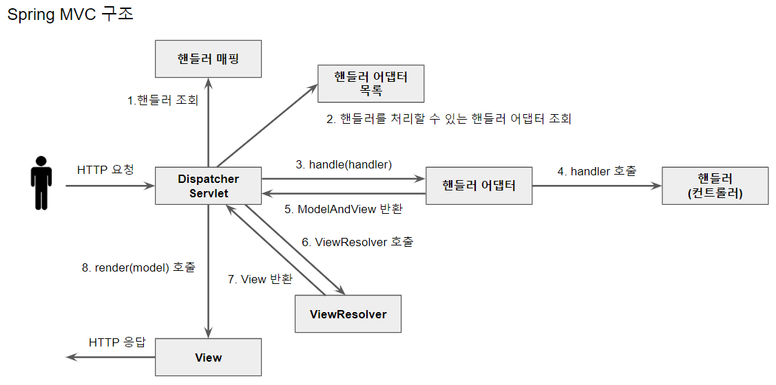 실행 흐름은 Handler Mapping을 통해 Handler를 조회하고 이를 실행 시킬 Handler Adapter를 조회한다. 이후 조회 된 Handler Adapter를 통해 Handler를 실행한다.